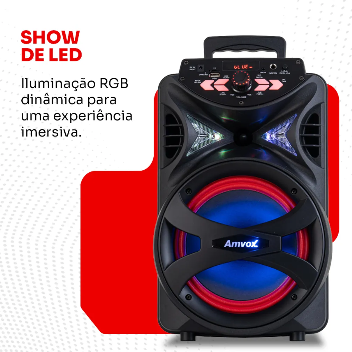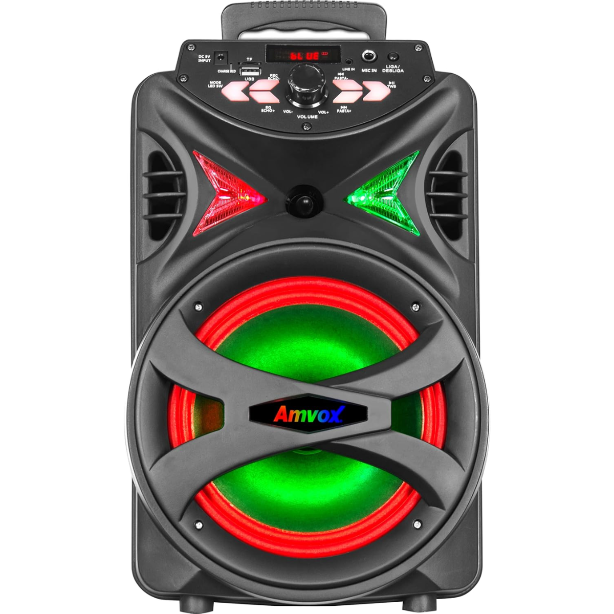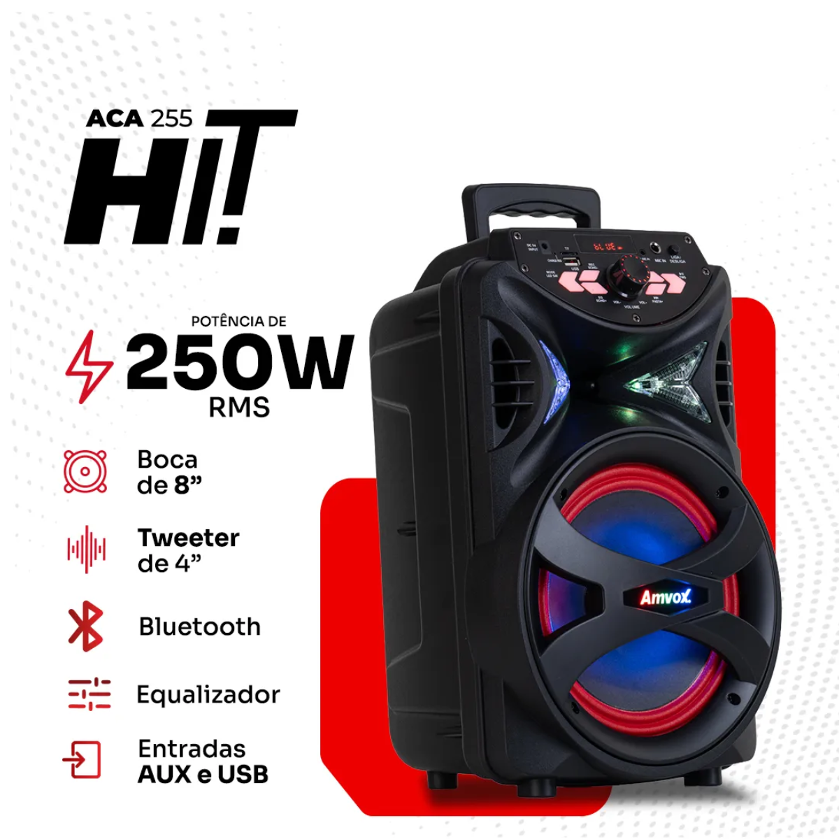 CAIXA DE SOM AMPLIFICADA AMVOX ACA 255 HIT 250W RMS BLUETOOTH LED BIVOLT ? POTÊNCIA E PORTABILIDADE PARA QUALQUER MOMENTO