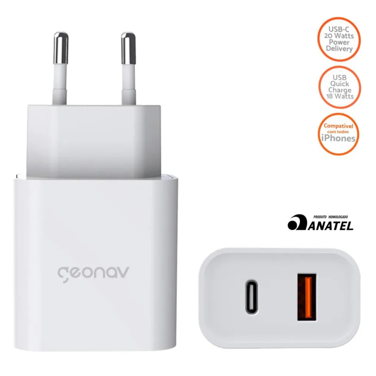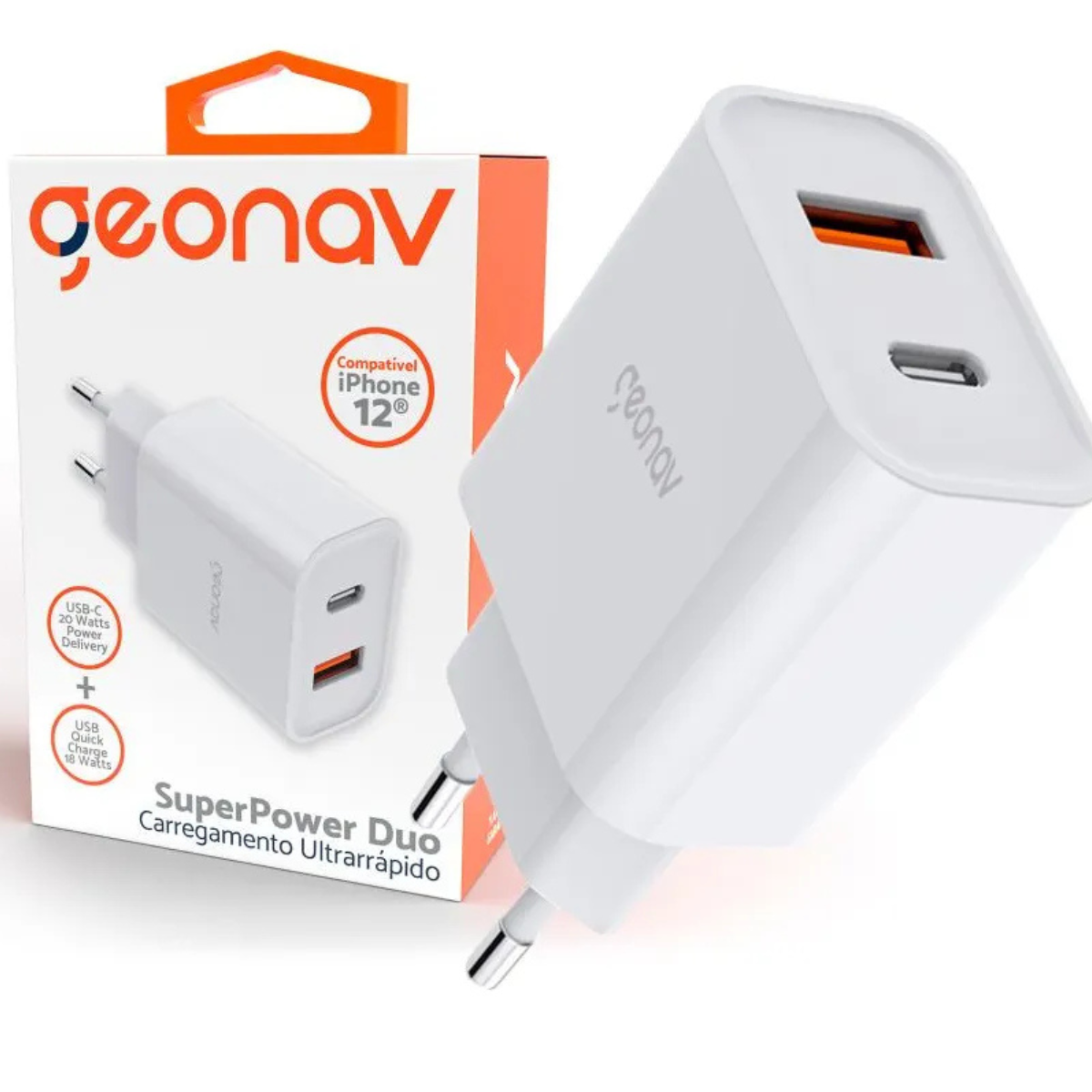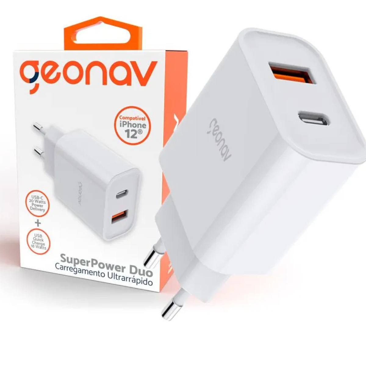 O Carregador Ultrarrápido Duplo Geonav CH20PDQC Branco é ideal para quem busca velocidade, segurança e compatibilidade com diversos dispositivos. Com tecnologia Power Delivery 20W e Quick Charge 18W, ele garante recargas eficientes e simultâneas.