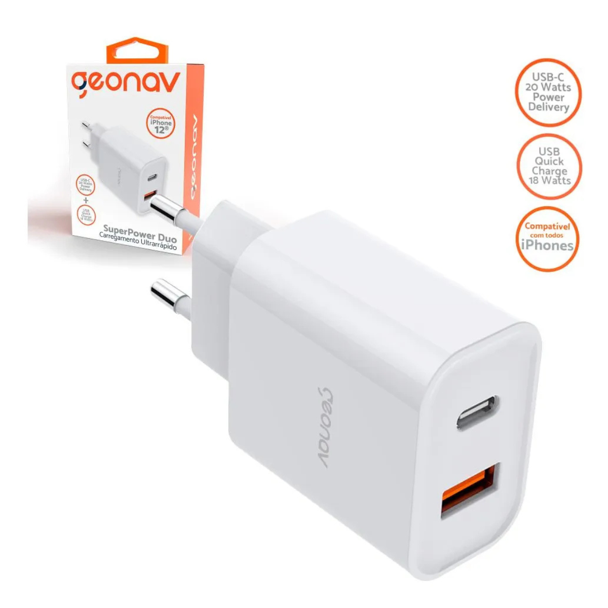 CARREGADOR ULTRARRÁPIDO DUPLO GEONAY BRANCO POWER DEIVERY 20W QUICK CHARGE 18W CH20PDQC