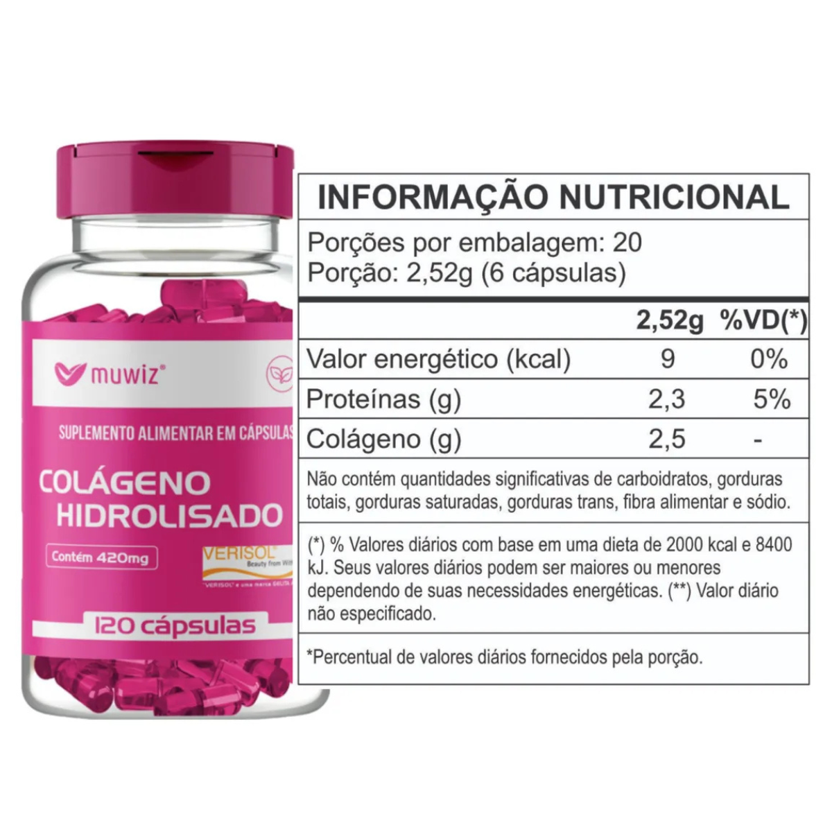 Porção diária: 840mg de peptídeos bioativos de colágeno Verisol®
