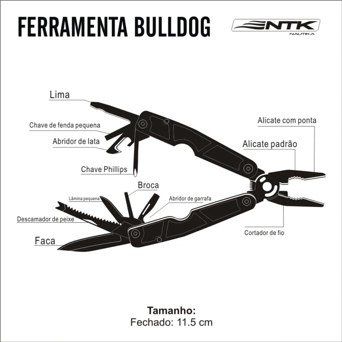 A Ferramenta Bulldog da Nautika (NTK) é multifuncional, compacta e prática, perfeita para camping, pesca, trilhas e uso cotidiano. Com design robusto e lâmina em aço inoxidável, ela reúne diversas funções em um único equipamento, garantindo utilidade e segurança em qualquer situação.