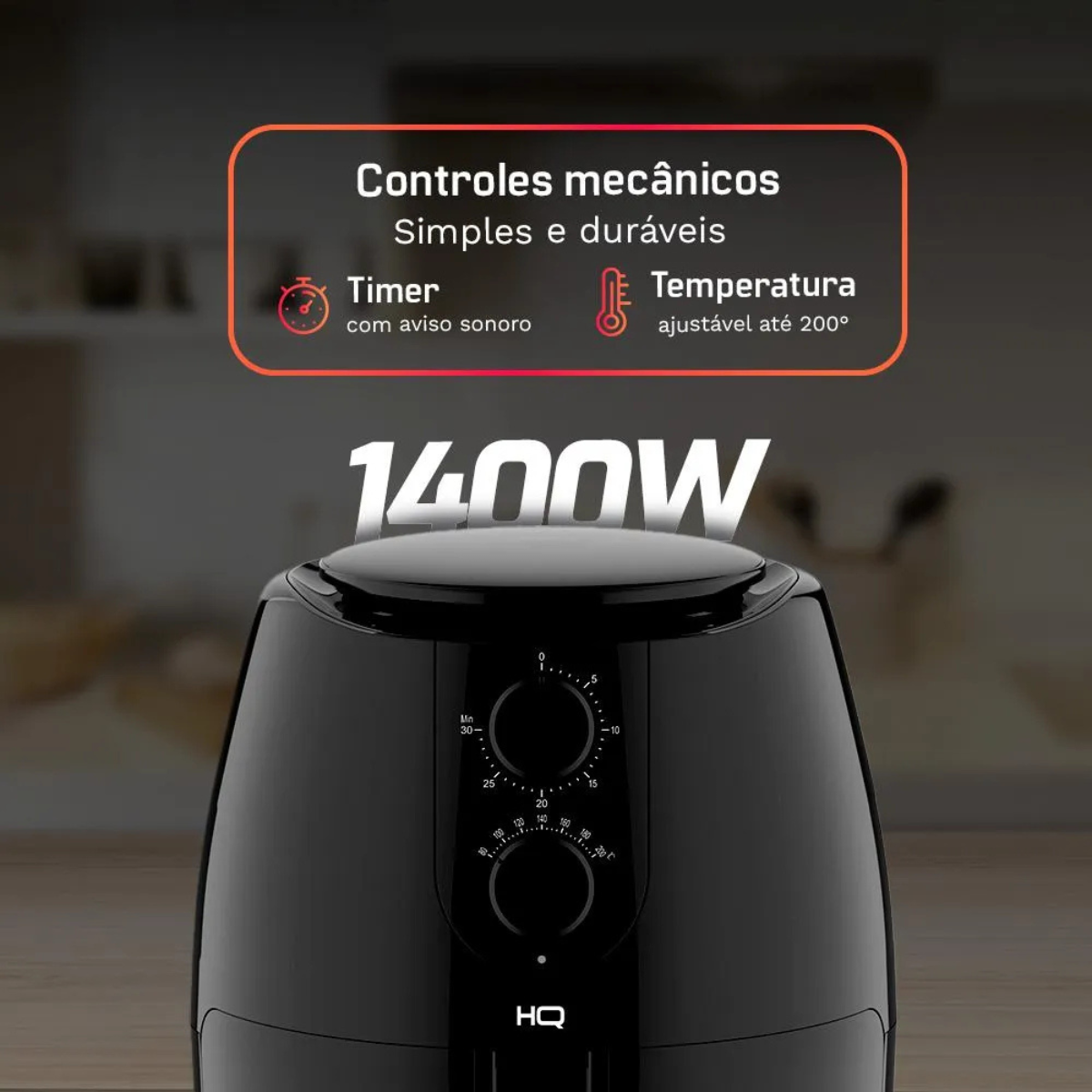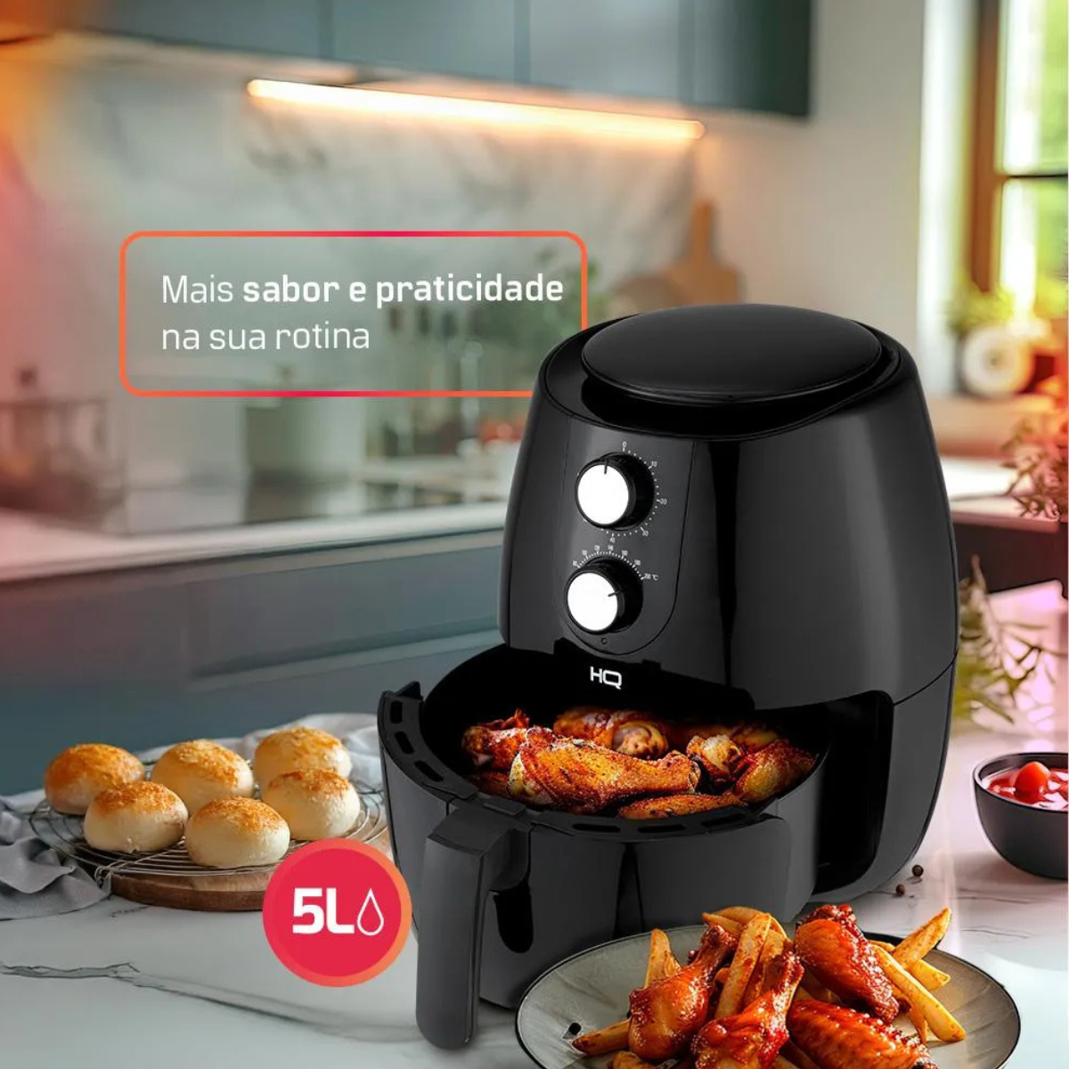 A AirFryer HQ 5L oferece uma forma saudável de preparar alimentos com rapidez e sabor. Seu controle de temperatura ajustável e timer de 60 minutos permitem preparar desde petiscos até pratos completos com facilidade. O cesto antiaderente removível facilita a limpeza, e o design em plástico resistente ao calor com acabamento em aço inox garante durabilidade e estilo.