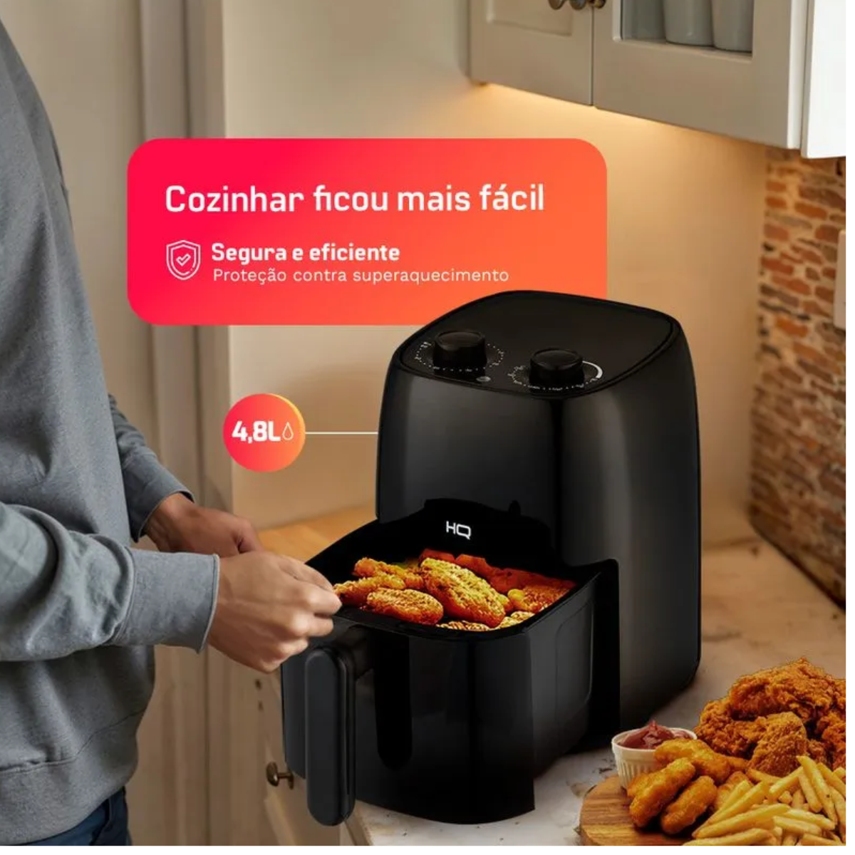 A Fritadeira Elétrica HQ 4,8L foi desenvolvida para quem busca rapidez, eficiência e saúde no preparo dos alimentos. Com capacidade de 4,8 litros, ela é perfeita para famílias e para quem gosta de preparar porções generosas de batatas, carnes, frangos e muito mais, sem usar óleo em excesso.
