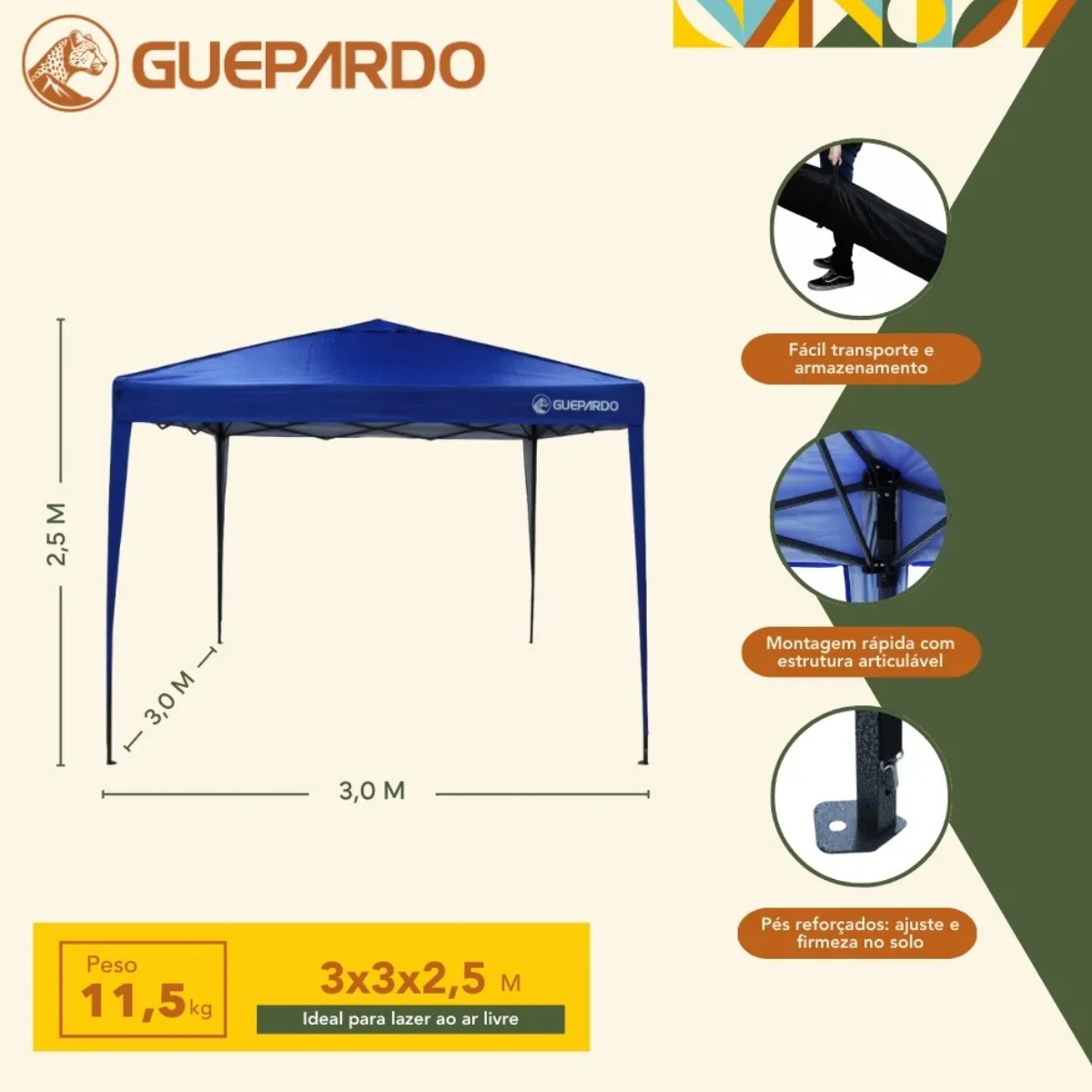 O Gazebo Pratiko 3x3m da Guepardo é ideal para quem busca conforto e proteção em ambientes externos. Com estrutura articulada sanfonada, proteção solar FPS 60, cobertura aluminizada, altura ajustável e coluna d?água de 1000 mm, ele é perfeito para praia, camping, feiras, quintais e eventos.