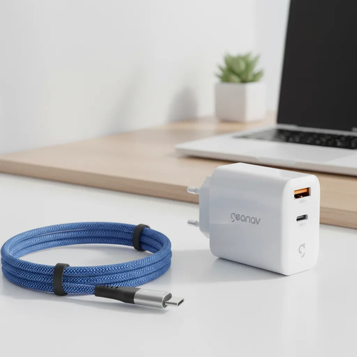KIT GEONAV: CABO USB-C MAGNÉTICO NYLON AZUL 100W + CARREGADOR 65W