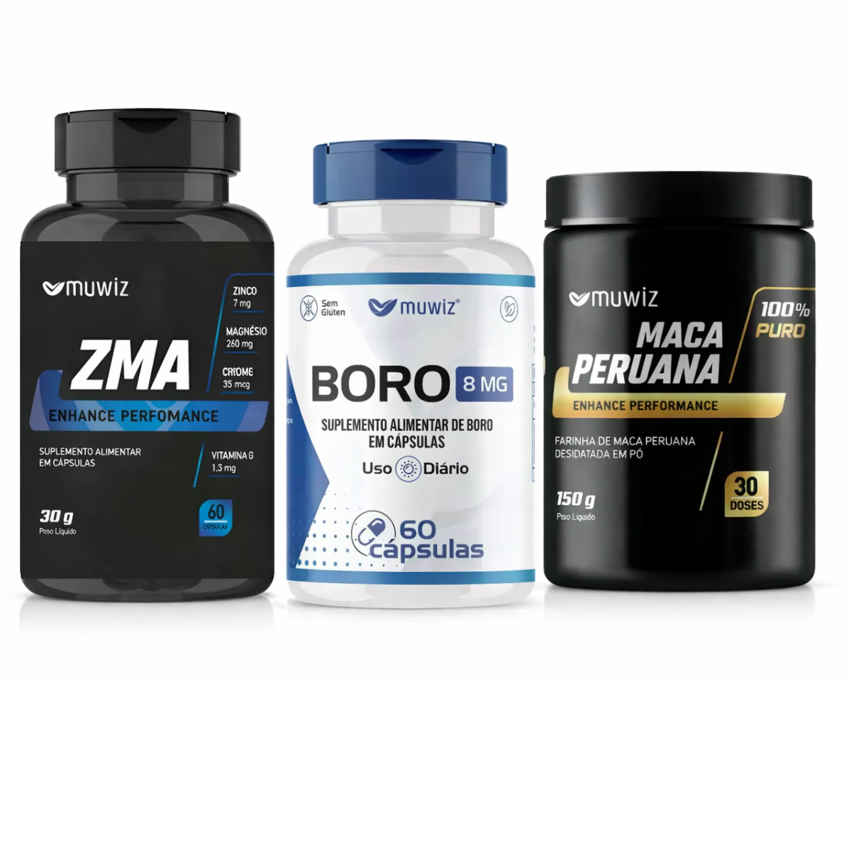 Kit Muwiz Maca Peruana 150mg Pó + Zma 500mg 60 Cáps + Boro 8mg 60 Cáps Suplementos Para Energia E Performance
