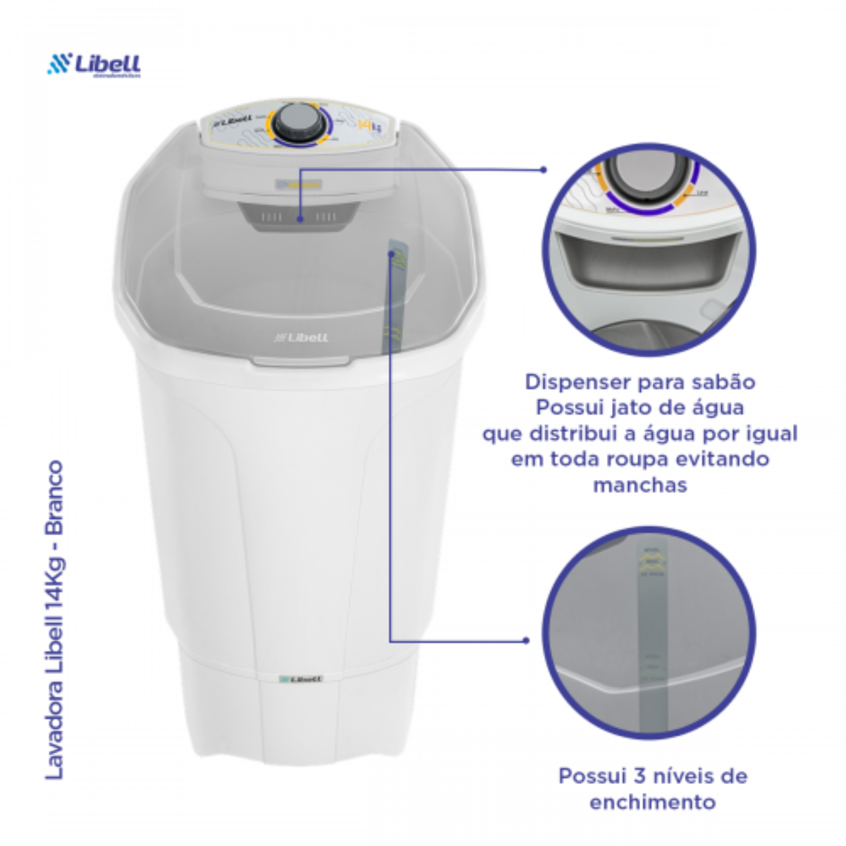 A Lavadora Libell 14kg Branca 127V é perfeita para quem busca alto desempenho, economia e praticidade na lavagem de grandes volumes de roupa. Com sistema de turbilhonamento, timer com 5 programas e design compacto, ela é ideal para o dia a dia.
