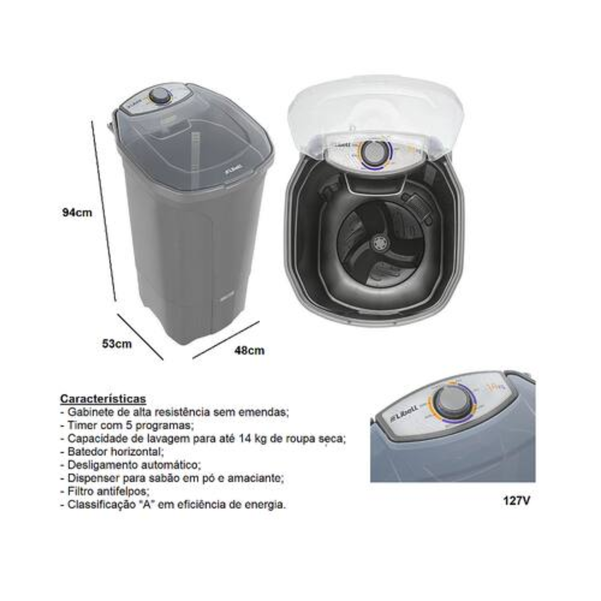 A Lavadora Libell 14kg Prata 127V é a solução ideal para quem precisa lavar grandes volumes de roupa com eficiência, economia e estilo. Com sistema de turbilhonamento, timer com 5 programas e acabamento moderno, ela une funcionalidade e sofisticação para sua lavanderia.