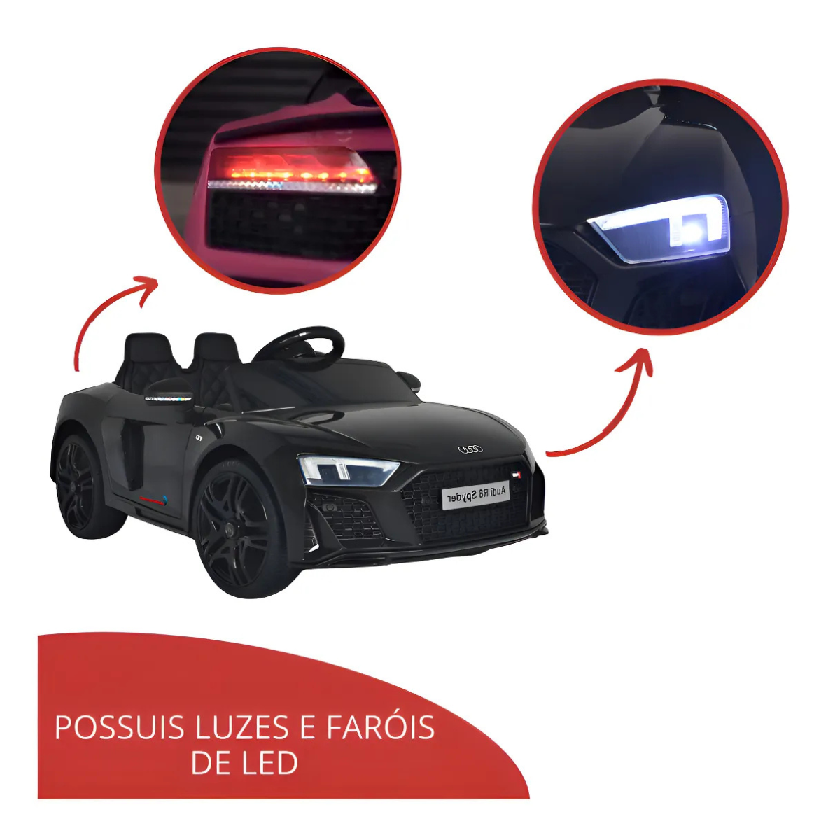 Deixe a criançada pegar a estrada com o Mini Carro elétrico Audi R8 Spyder! As brincadeiras ficarão muito mais realistas, pois o mini carro possui luzes, som e função frente e ré. O design incrível é licenciado pela Audi. O mini veículo pode ser controlado pela criança por meio de acionamento de pedal e controle da direção, assim como, por um adulto utilizando o controle remoto. É ideal para crianças de 2 anos a 5 anos, com capacidade de até 25kg. Possui marcha para frente, ré e neutro. Simplesmente o melhor do passeio com a maior aventura. Altamente resistente e durável, peças de qualidade, selo INMETRO e ANATEL, para assim, garantir conforto, e principalmente, segurança para os pequenos pilotos.