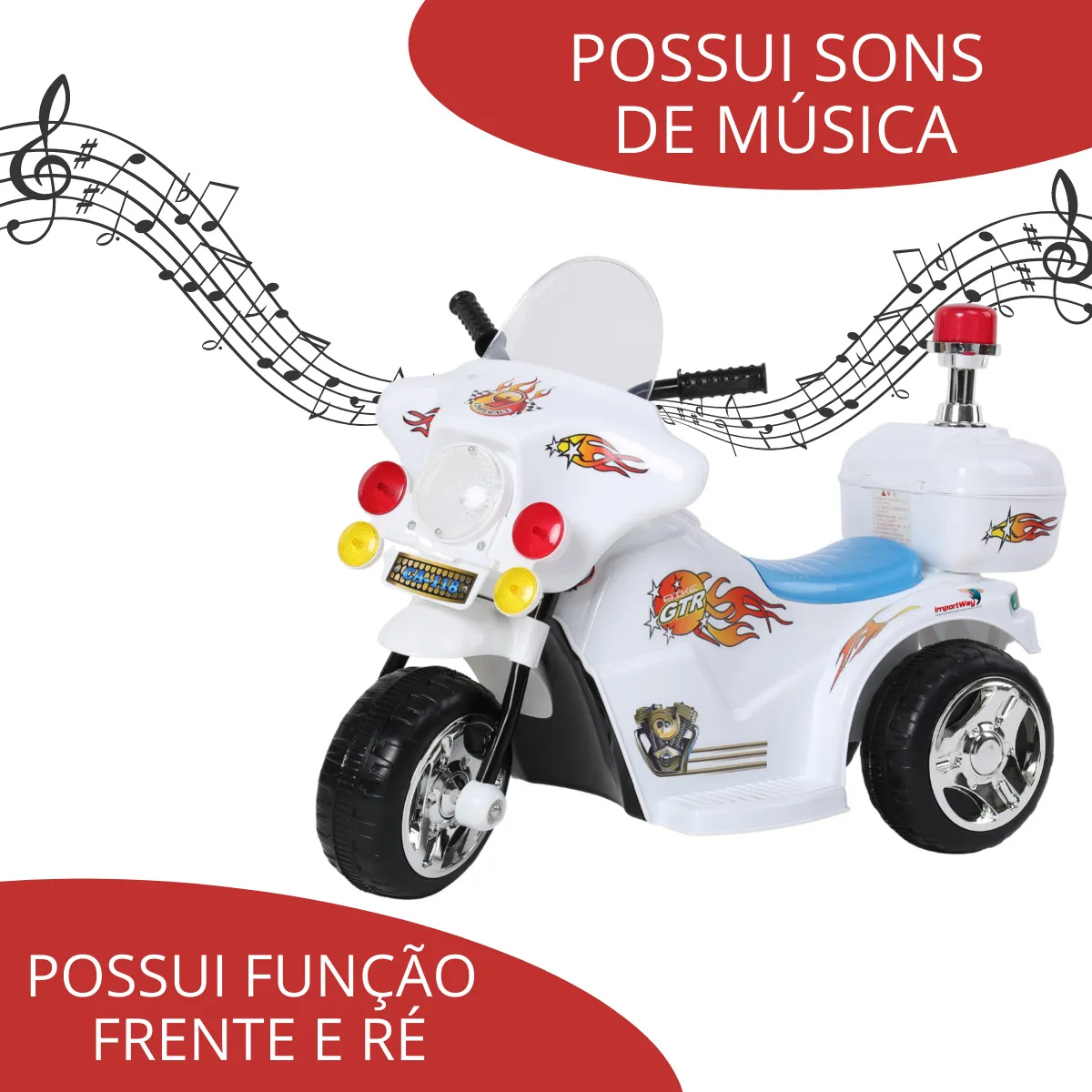 Além de transmitir toda a sensação de um verdadeiro motoqueiro ou motoqueira, a Mini Moto possui sistema com som, luz de farol e sirene.