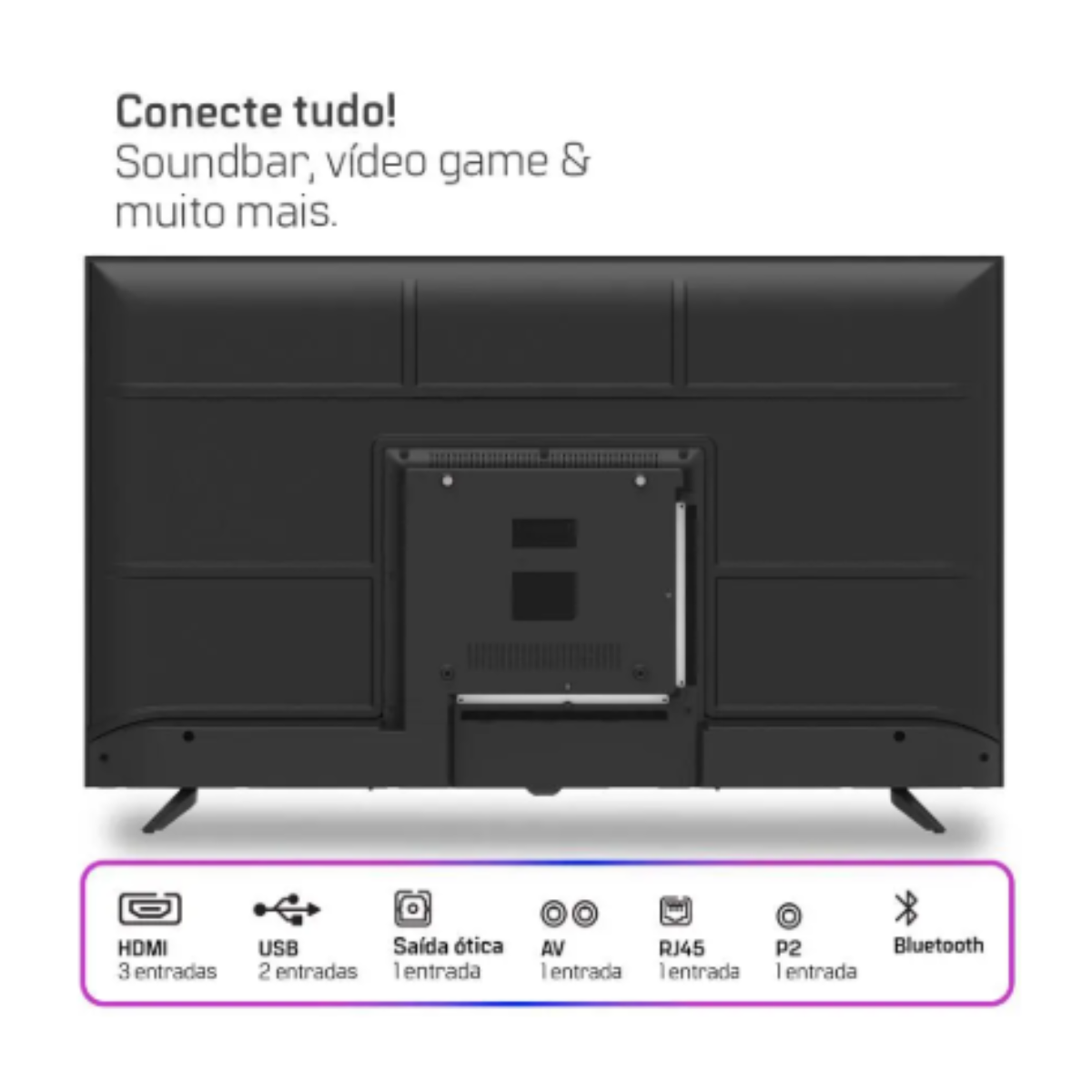 Além disso, conta com Wi-Fi e Bluetooth integrados , facilitando a conexão com internet, caixas de som, celulares e outros dispositivos. Com entradas HDMI e USB, você pode conectar videogames, notebooks e muito mais com praticidade.