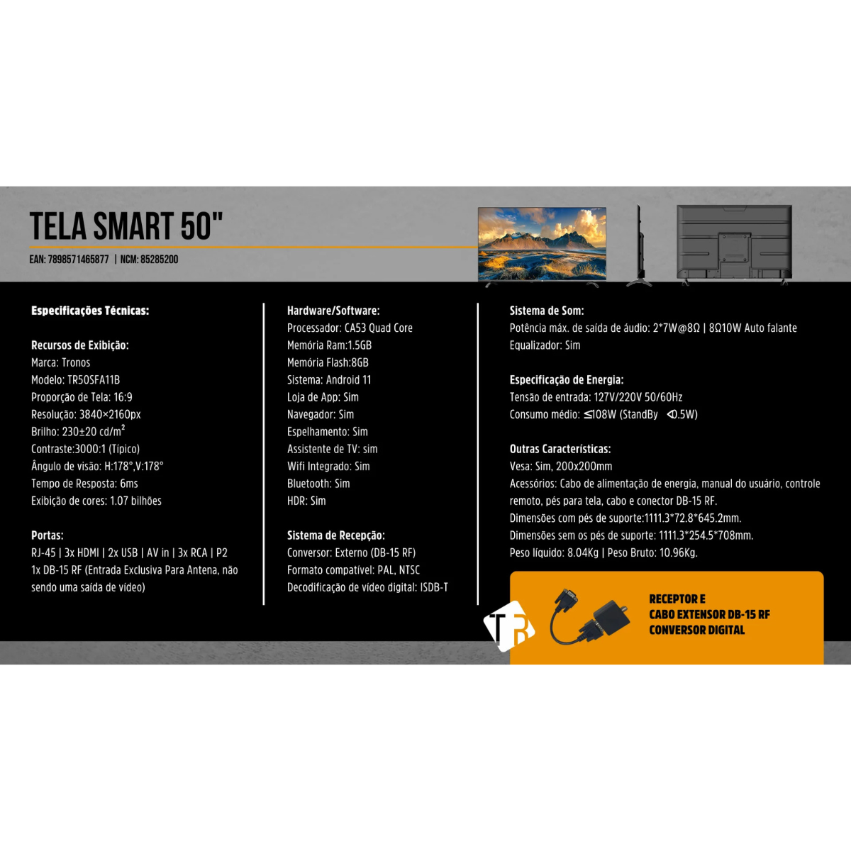 A TV Tronos TRS43SFA12B é uma TV inteligente de 43 com imagem Full HD, Android 12 e processador Quad-Core. Conta com conectividade ampla, como acesso a apps, espelhamento de dispositivos e compatibilidade HDR, além de múltiplas conexões (3 HDMI, 2 USB, AV, RJ-45, Bluetooth, Wi-Fi e entrada para antena) e bom desempenho de som. Ideal para quem busca praticidade, entretenimento e instalação versátil, tudo com baixo consumo de energia e eficiência em stand-by.